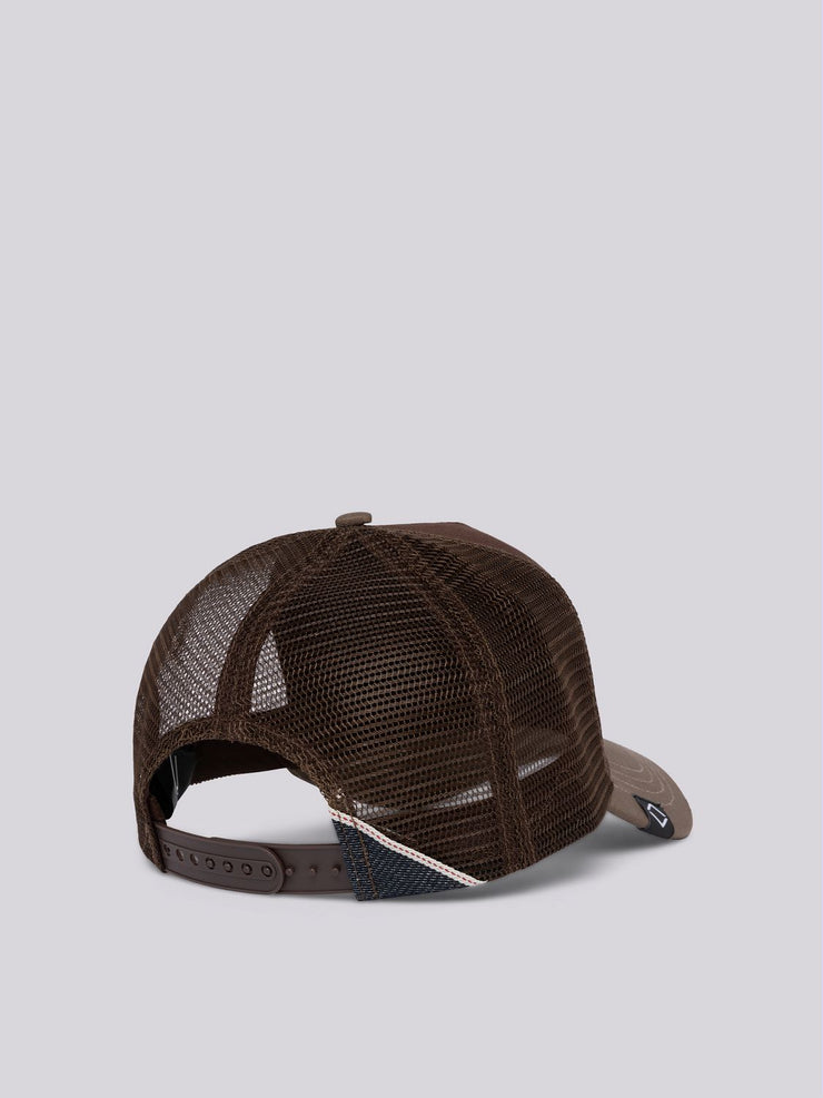 Cap with bill made of cotton twill with back in mesh and inner lining in cotton blend fabric. The item is characterized by the customized applique with lion at the front. The accessory is refined by the edges with micro abrasions for a used effect. Adjustable back.